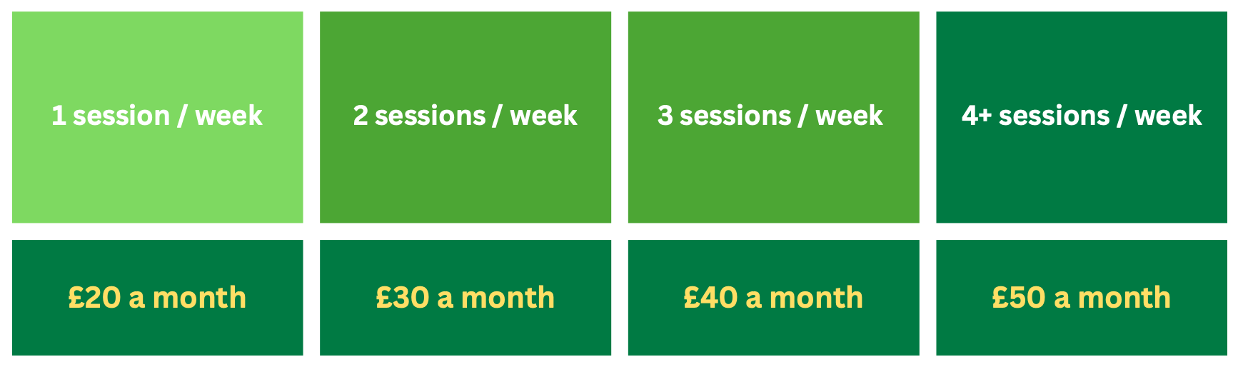 All sessions are paid monthly, preferably by standing order, payable by the 7th of the month. The monthly cost according to the amount of weekly sessions is as follows:
